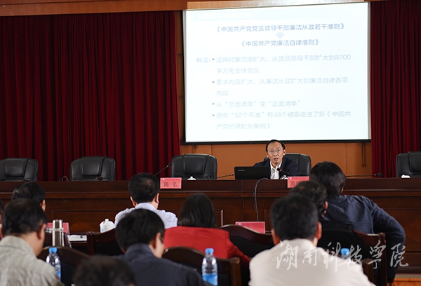 本网讯(记者 肖浪 摄影 何帅文)4月15日下午,湖南省教育厅纪检组副组长、监察室主任黄扬清以“透过案例看执纪”为题给党委中心组(扩大)和处干班作专题辅导。校党委书记陈弘主持并讲话。