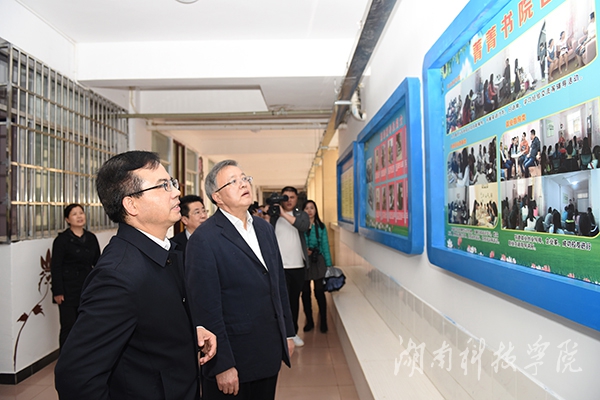 本网讯(记者 张云芳 摄影 何帅文)4月7日下午,省政协副主席欧阳斌、省政协文史学习委员会主任张智军等一行在永州市政协主席唐定、市政府副市长刘尤碧等领导的陪同下莅临我校,考察了电子与信息工程学院创新创业中心、外国语学院菁菁书院、美术与艺术设计学院大学生创新训练中心、图书馆、音乐楼、体育馆。校领导陈弘、曾宝成、宋宏福、郑山明、李常健、程智开陪同调研。