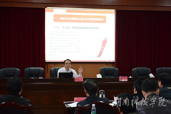 本网讯(记者 裴滢) 12月10日上午,党委学习中心组在行政办公楼八楼一会议室举行专题辅导报告会,集中学习党的十八届五中全会精神,邀请省委宣讲团成员、省政府发展研究中心副主任唐宇文作宣讲。校党委书记陈弘主持。校领导曾宝成、唐艳明、宋宏福、彭立威、郑山明、李常健、吴小林、程智开、袁先友、陈仲庚等校领导,全校副处级以上干部,党群部门副科级以上干部和马克思主义学院全体教师聆听了报告。