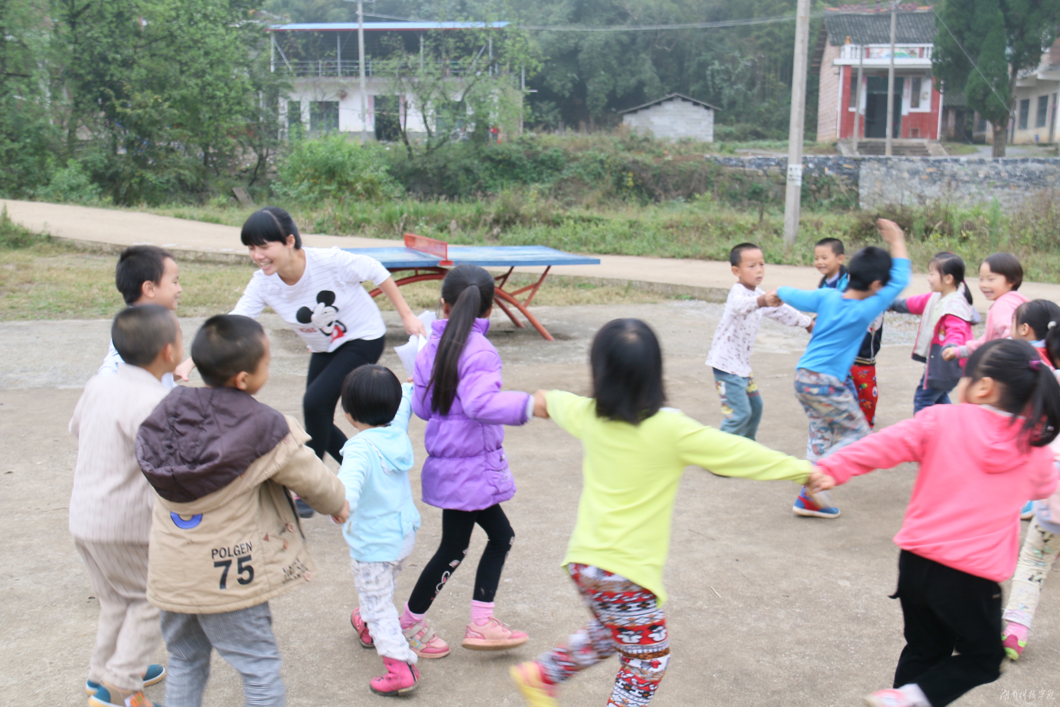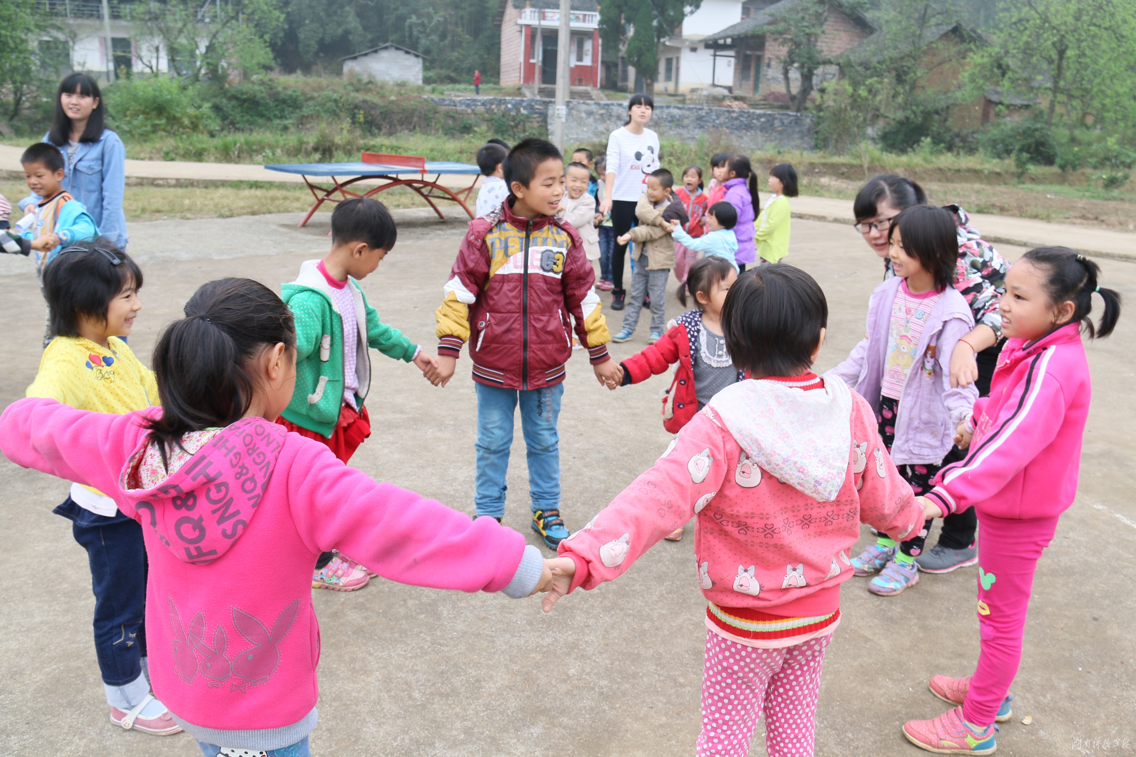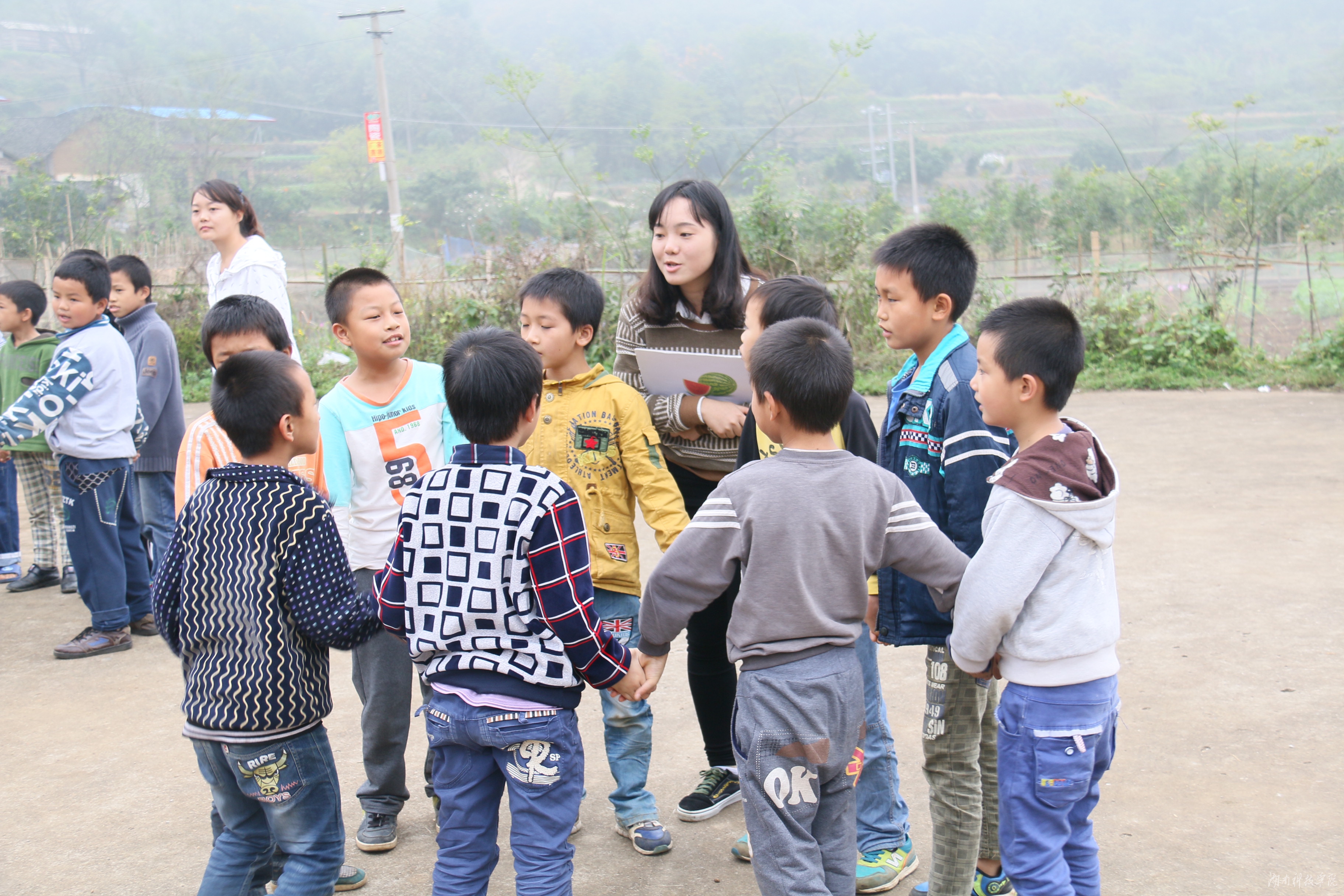 操场上,孩子们列队整齐,眼神中充满了期盼。志愿者们纷纷上前,带领孩子们做游戏,开展体验活动。孩子们被分成八个小组,由志愿者们带队欢快地围绕在他们的身边,唱啊跳啊,高兴极了。他们时而围成一圈,时而跳起“踢踏舞”,时而猜起了谜语……,尽管秋雨阴冷,但近两个小时的活动很快就结束了。活动结束时,孩子们还高兴地领到了发给他们的“最佳团队奖”、“最具创意奖”、“最具活力奖”等奖状和学习用品、书本等奖品。