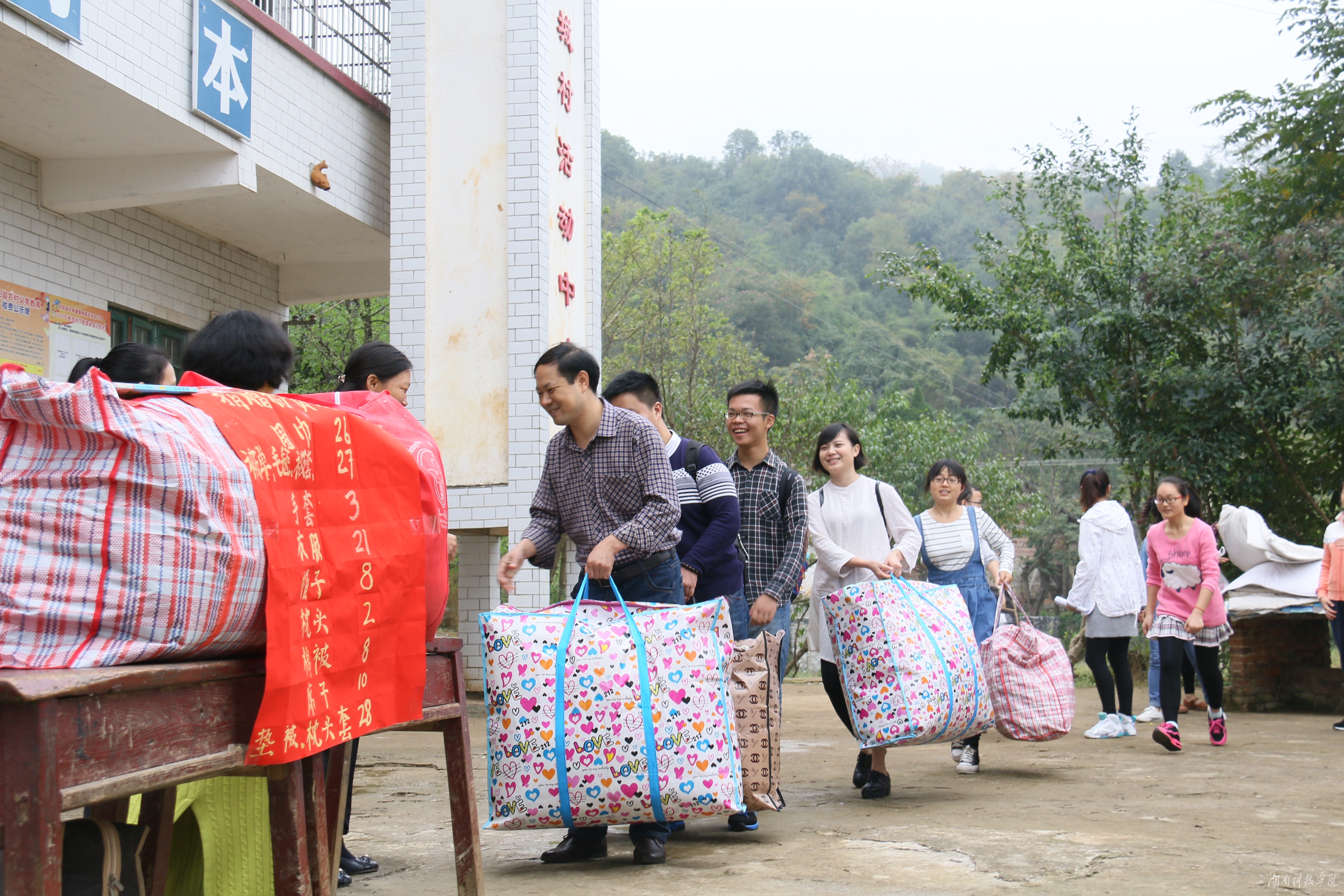 深秋的寒冷和秋雨抵挡不住师生们的热情。一大早,学生记者和志愿者们忙着打包装袋。经过近2个小时的路程颠簸,上午10时抵达学校,大家连忙将携带的衣物、棉被、手套等卸下车,搬进用教室隔断的孩子们的宿舍里。