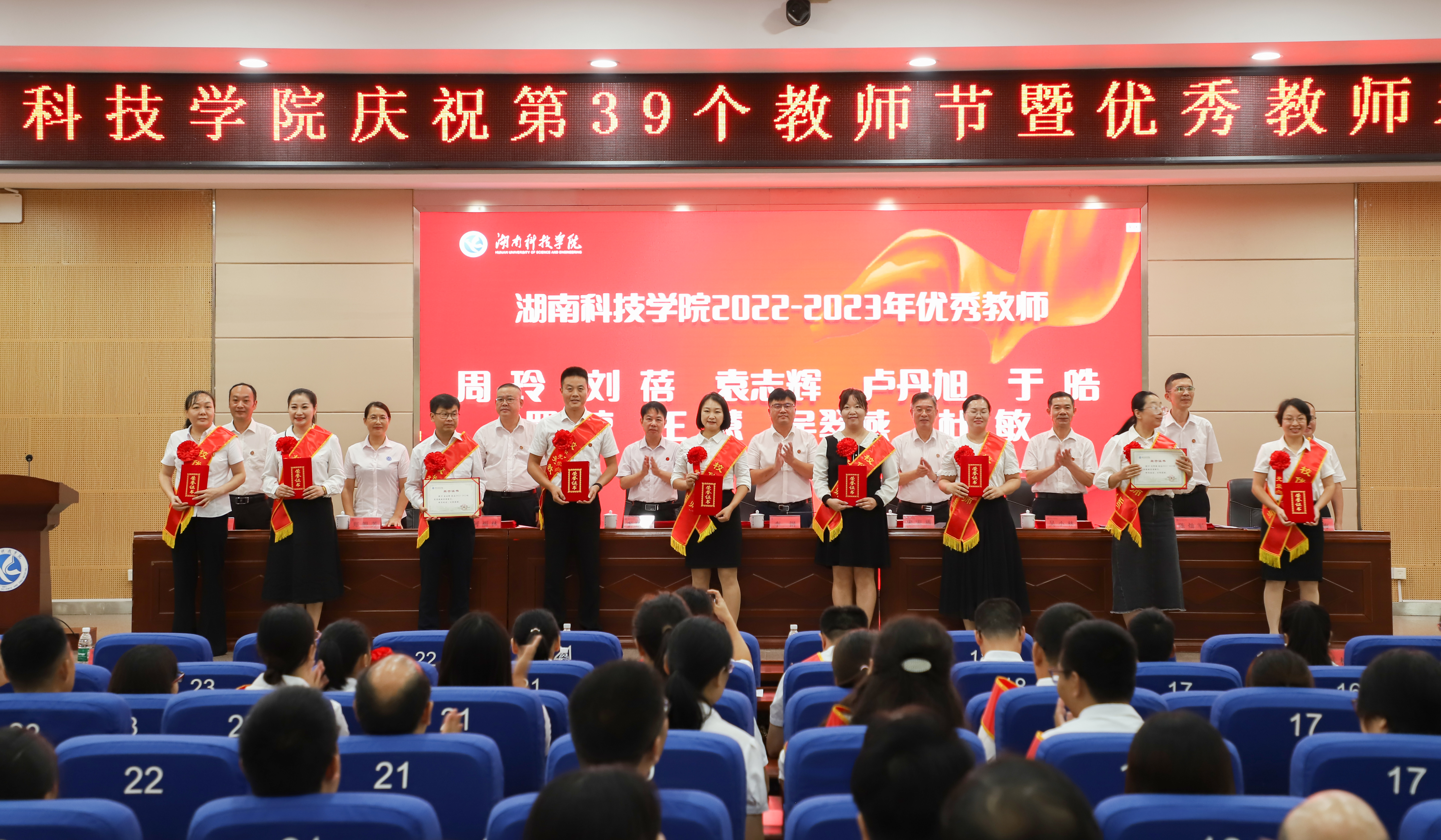 党委委员、副校长李常健宣读表彰决定,外国语言文学教学团队获2022年湖南省教育系统第九轮“芙蓉杯”竞赛标兵岗、廖雅琴获2022年湖南省高校第二届“最美思政课教师”、彭凡思获2022年湖南省高校第二届“最美辅导员”、王晶晶获2022年湖南省高校“辅导员年度人物提名奖”、张剑获2023年“永州市教书育人楷模”、黄燕平获2023年“永州市优秀教师”、朱湘萍获2023年“永州市优秀班主任”、何丽萍获2023年“永州市优秀教育工作者”、朱湘萍等10位教师获校师德师风标兵、于皓等30位教师获校优秀教师、吴青霞等14位教师获校先进教育工作者、刘晓慧等15位教师获校服务育人好员工,彭凡思等4位教师获校优秀辅导员,肖献军等4位教师入选2022年度学校“英才支持计划” ,盘俊等4位教师入选2022年度学校“青苗支持计划”。