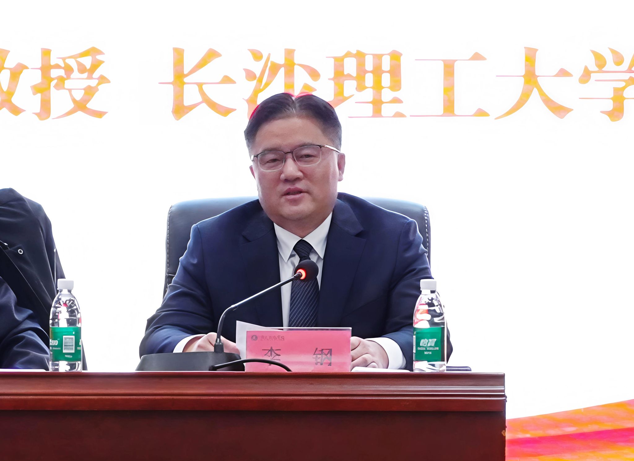 本网讯(记者 张云芳) 1月6日下午,学校党委理论学习中心组(扩大)举行2026年第1次集体学习,特邀长沙理工大学党委书记付宏渊教授来校作题为《全面贯彻党的二十届四中全会精神,推进湖南高等教育高质量发展》的辅导报告。校党委书记李钢,党委副书记、校长黄创霞等全体在校校领导出席报告会。李钢主持报告会。