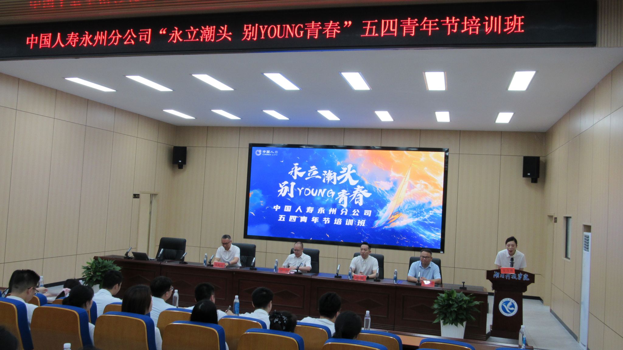 本网讯(通讯员 邹小阳)5月22日,中国人寿永州分公司与我校联合举办的“永立潮头,别YOUNG青春”五四青年节培训班在我校举行。中国人寿永州分公司党委书记、总经理刘翀,中国人寿党委委员、总经理助理蒋周成及该公司的70名青年员工参加开班仪式,校党委委员、副校长何海出席并作开训致辞。