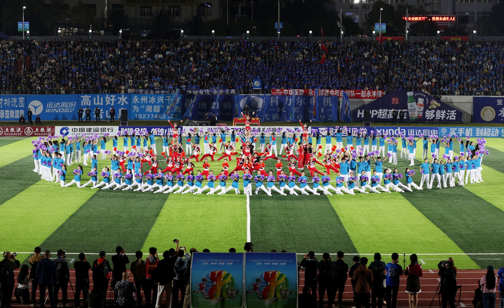 本网讯(通讯员 盘华)10月26日,第七轮湖南省足球超级联赛永州主场对阵长沙,开场前在赛场中央激情上演了一场视觉盛宴,我院盘华、郑华艳和美术与艺术设计学院李国碧老师带领的200多名啦啦操队员用她们充满活力与激情的表演,瞬间点燃了现场球迷的热情。
