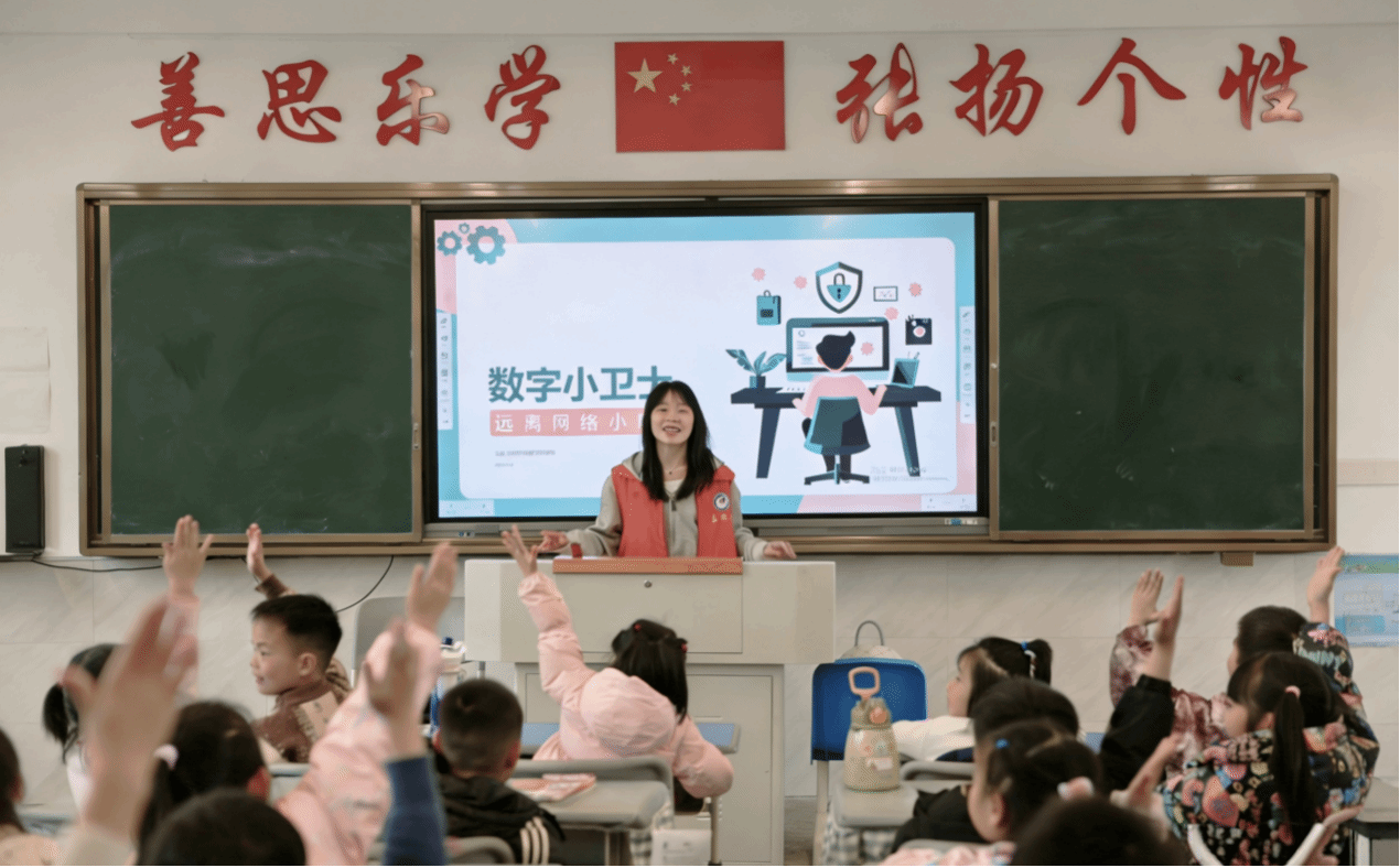 在互动环节,孩子们纷纷举手,分享自己或身边人遇到的网络“小陷阱”。随后的知识问答与“陷阱辨别大挑战”游戏穿插进行,答对的学生获得小奖品,现场掌声与欢笑声此起彼伏。志愿者总结安全上网要点时,教室里响起热烈的掌声。