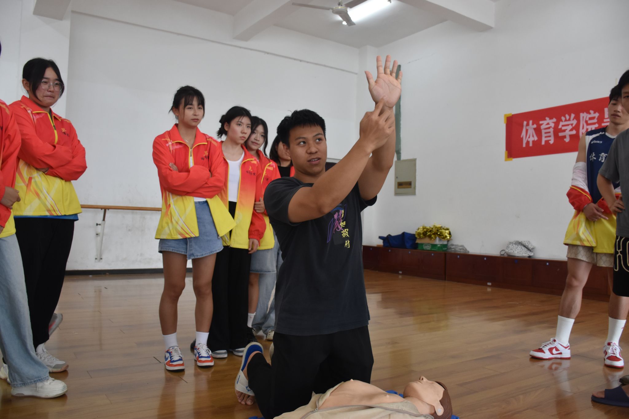 本网讯(通讯员 黄婉 黄小龙)6月19日下午,体育学院为今年参加暑期“三下乡”的志愿者开展了急救技能培训和防溺水安全知识讲座,学院《体育保健康复》课程教师张医鸿和国家级游泳救生员何俊华同学担任本次培训的讲师。