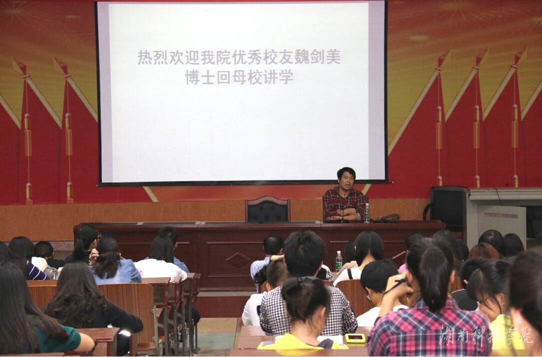本网讯(通讯员 涂楚琪 袁玲玲)10月24日下午,人文与社会科学学院邀请当代著名作家、湖南师范大学新闻传播学院副教授、我校优秀校友魏剑美回母校讲学。他以“浮躁时代如何静下心来读书”为题在明德楼报告厅为新生上了一堂精彩的课。该院院长潘雁飞、副院长贡贵训,党总支副书记邓先军,科技处副处长杨再喜出席讲座。